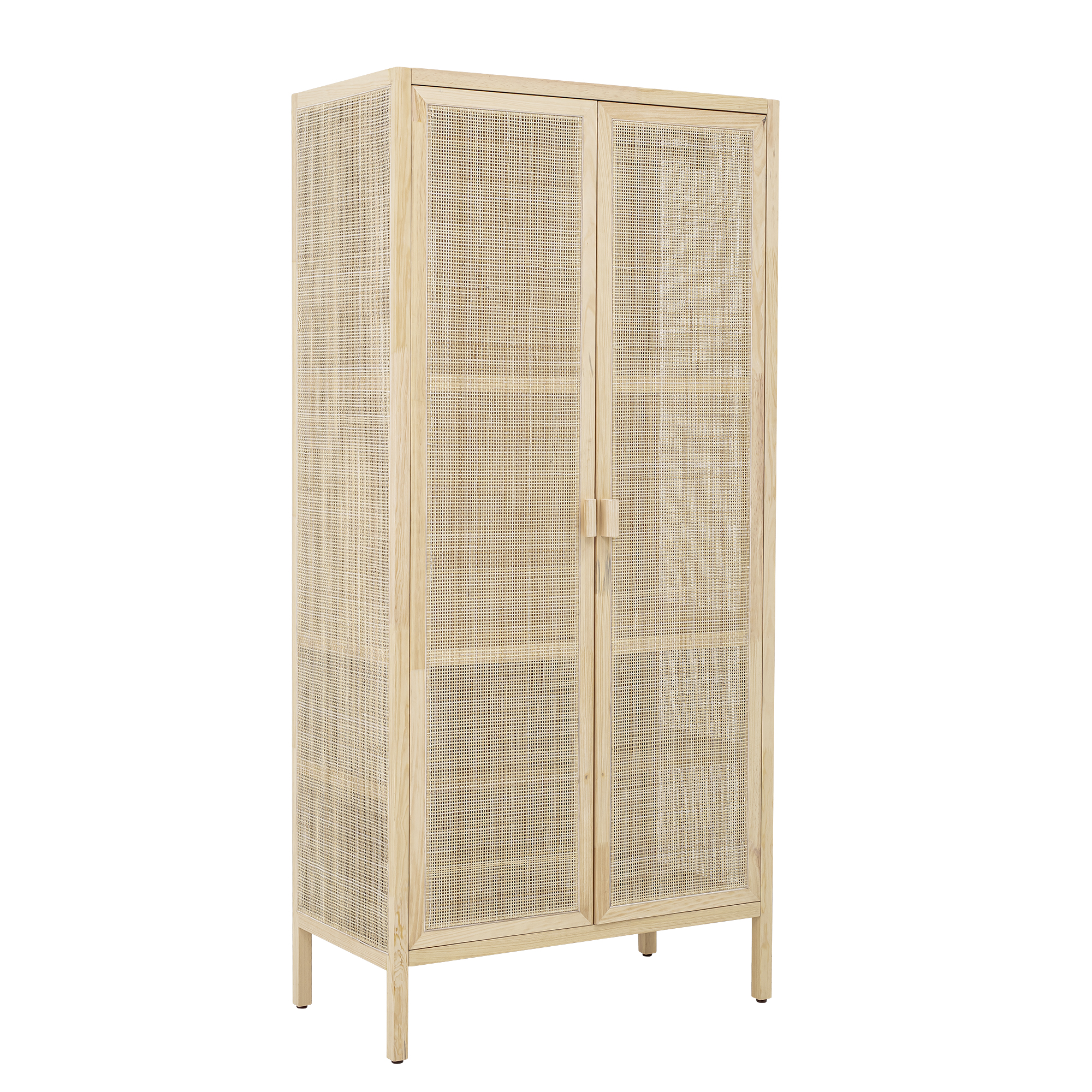 Une armoire en pin naturel et rotin au style nordique, idéale pour créer un intérieur lumineux et apaisant. Ses portes ajourées en rotin apportent légèreté et chaleur, tandis que sa grande capacité de rangement s’adapte au quotidien. Un meuble de rangement en bois clair élégant et facile à intégrer.