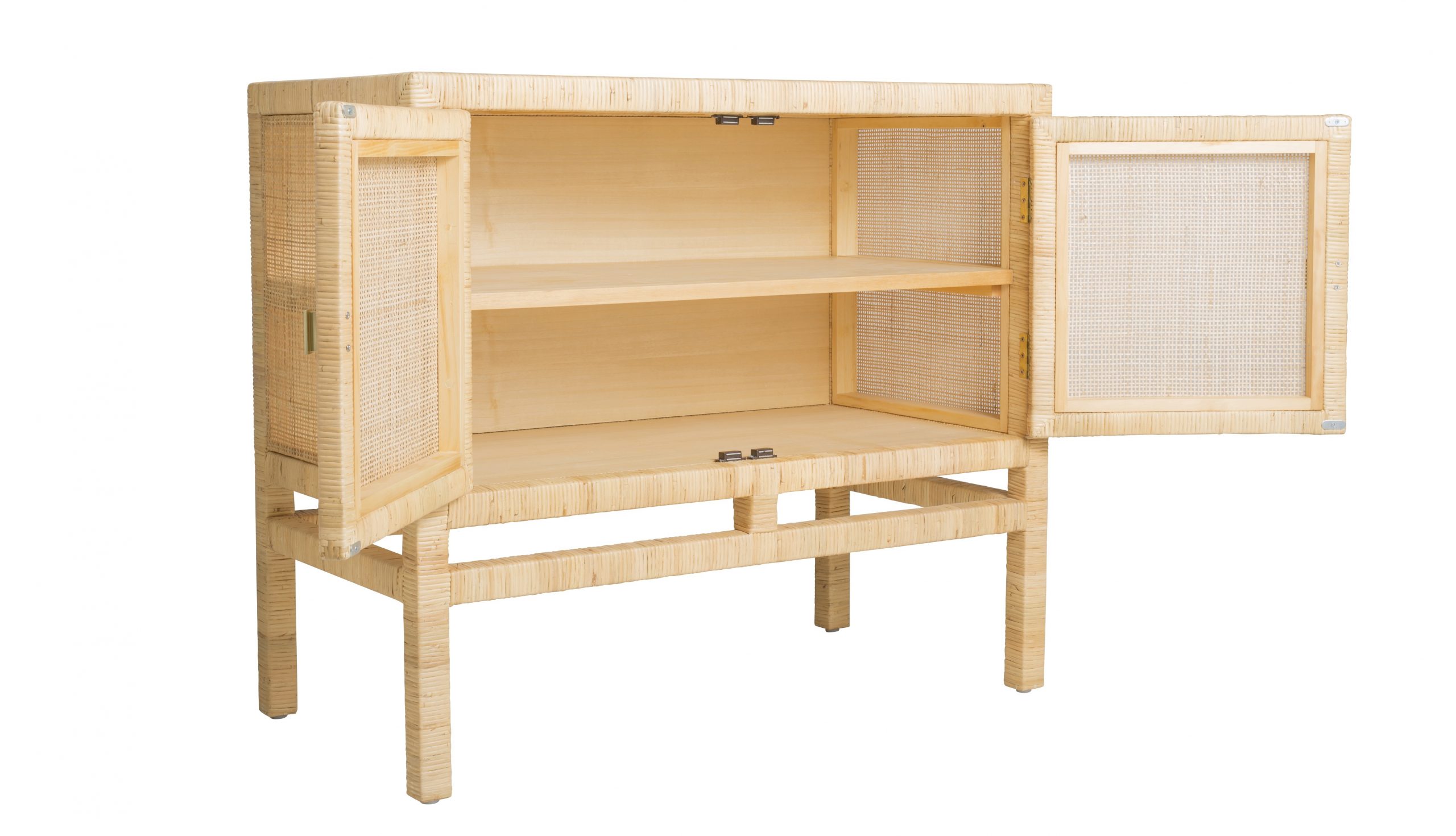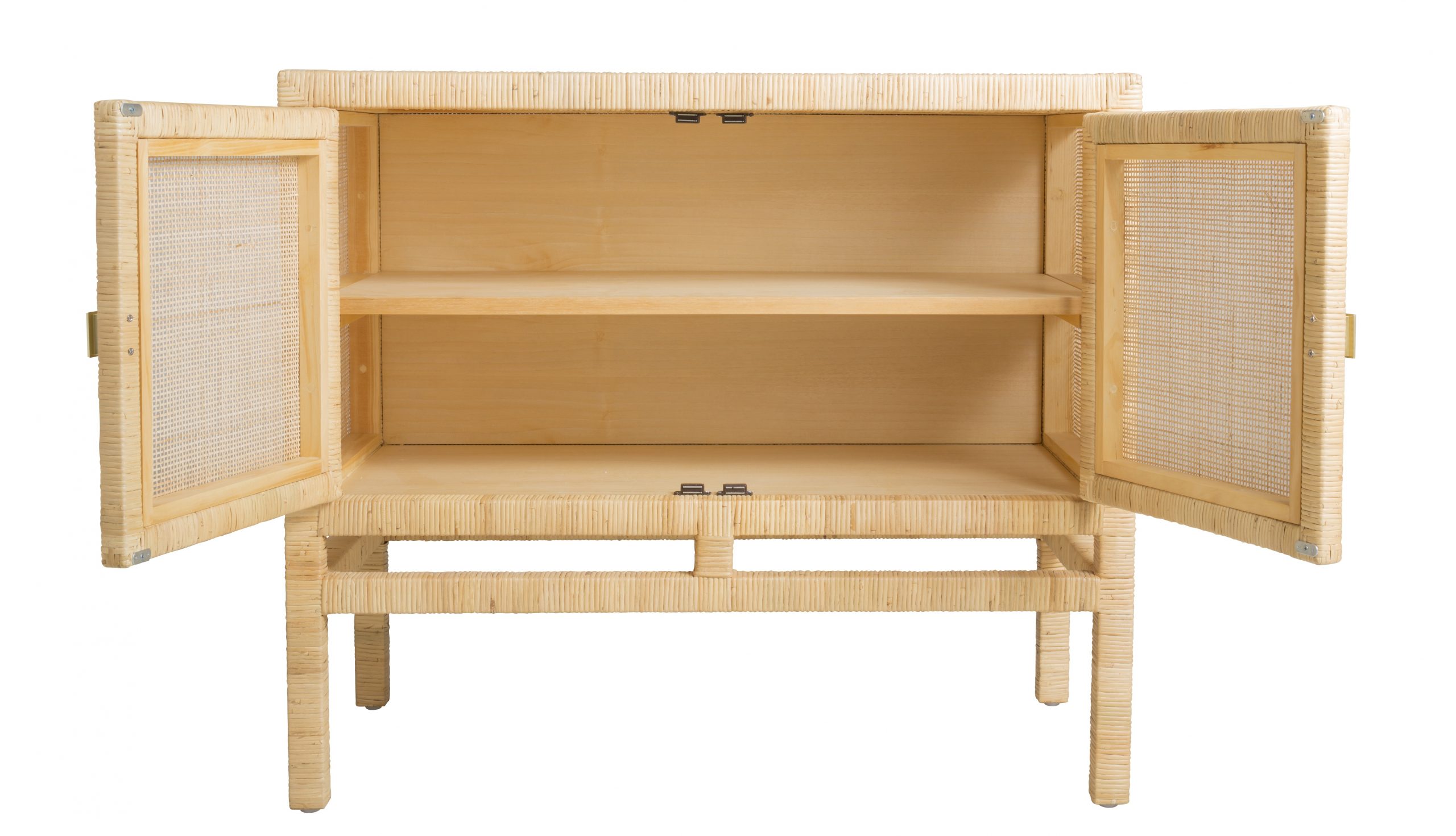 Le buffet 2 portes en rotin et cannage Saigon séduit par son équilibre subtil entre légèreté visuelle et fonctionnalité. Reprenant le même motif de tissage raffiné que les assises de la collection Saigon, il joue avec la lumière grâce à un cannage ajouré sur les côtés, inspiré des moucharabiehs traditionnels. Le dessus, fermé et tissé sur une base en bois, offre une surface idéale pour exposer objets décoratifs, luminaires ou vaisselle choisie.