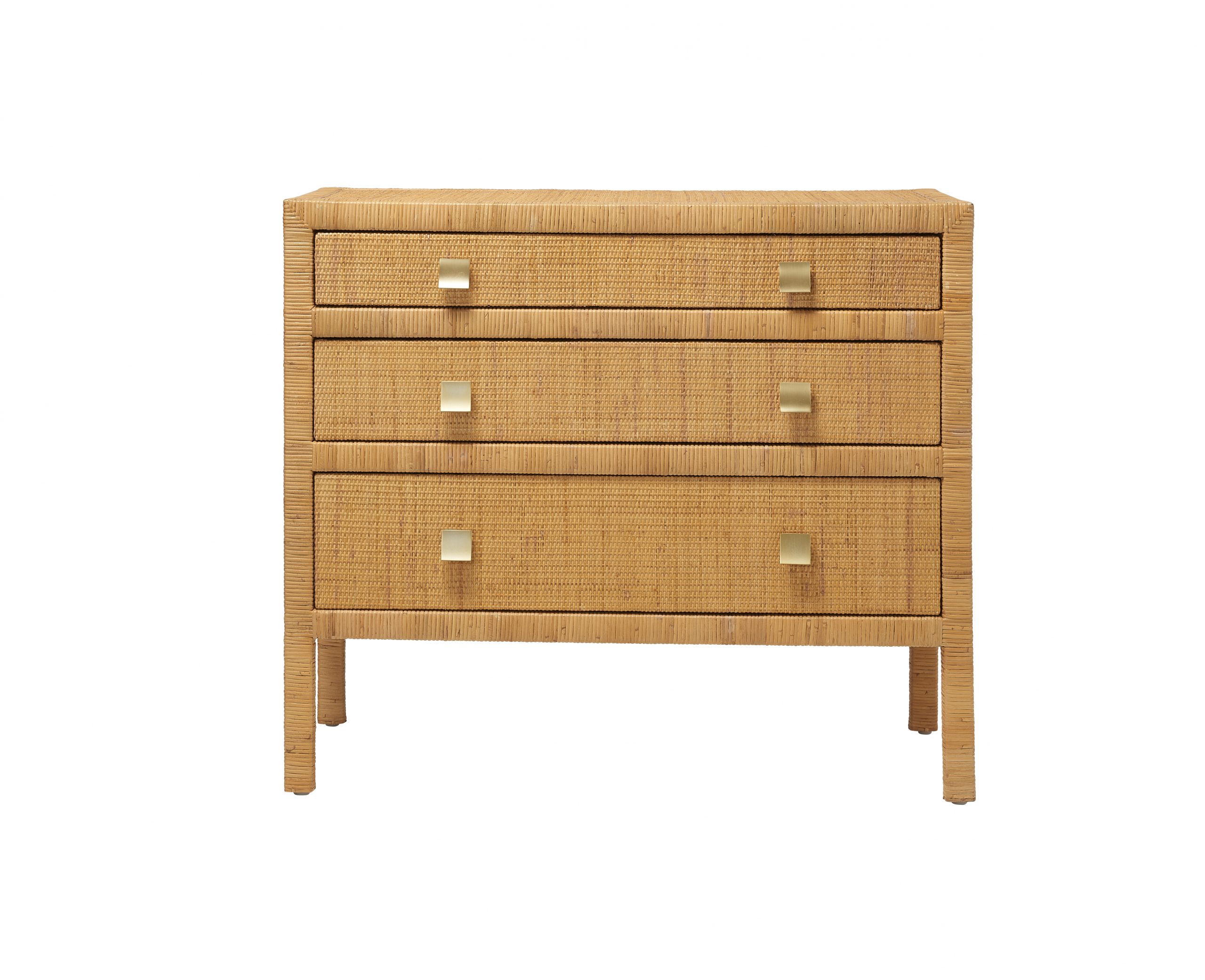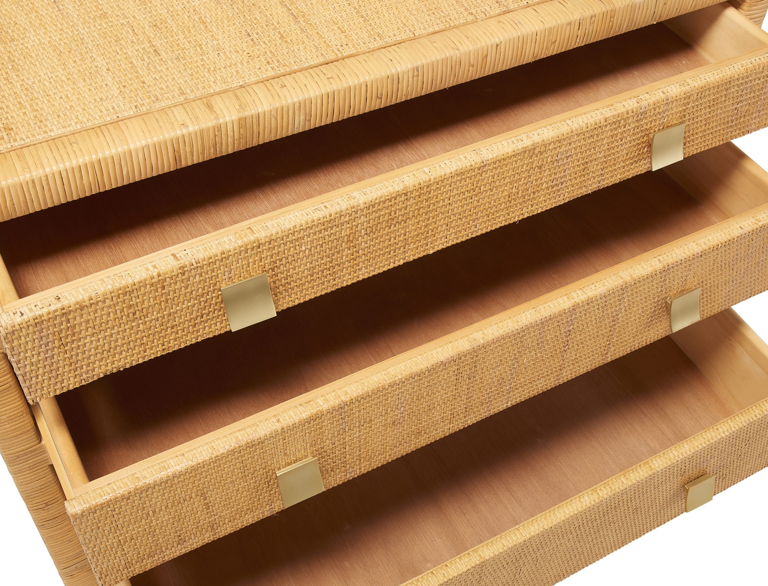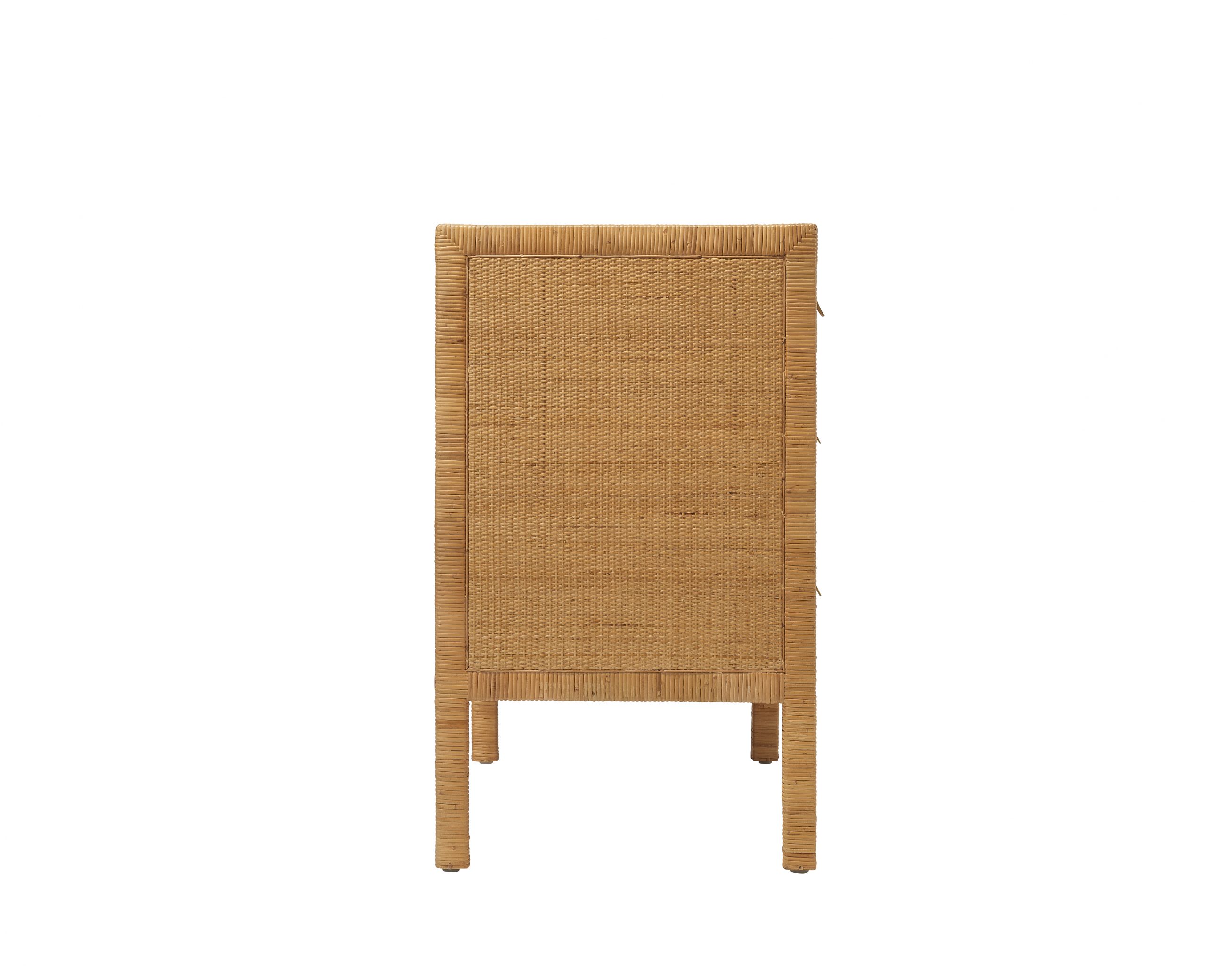 Cette commode en rotin se distingue par l’organisation harmonieuse de ses tiroirs. Montés sur glissières métalliques à roulement à billes, ils offrent trois profondeurs différentes, du plus fin au plus généreux, pour un rangement fluide et intuitif. Les tiroirs en pin massif, associés à une structure robuste, assurent une utilisation confortable au quotidien tout en conservant une grande légèreté visuelle.