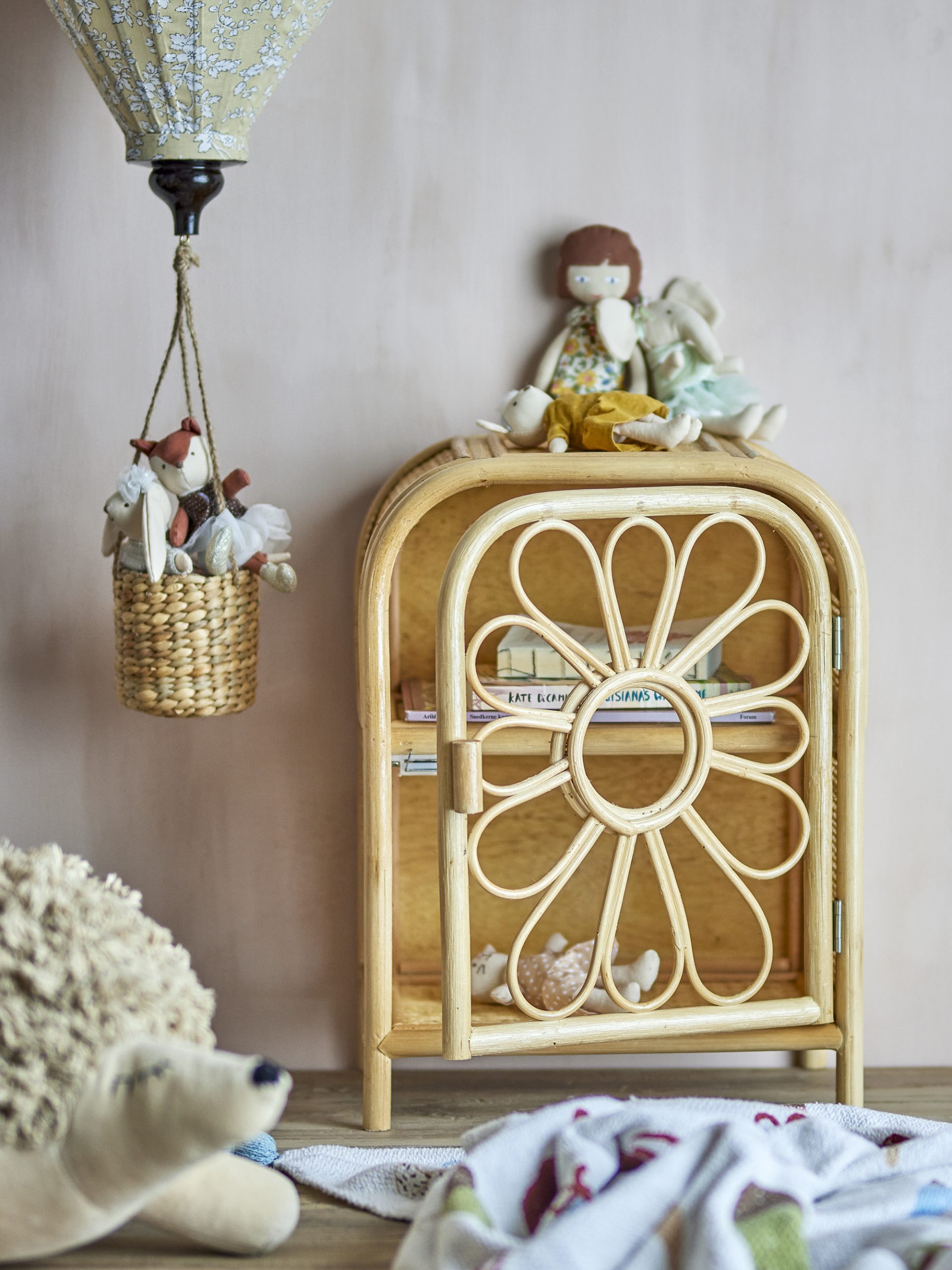 Derrière sa porte, une étagère permet d’organiser jouets, livres ou petits objets du quotidien. La structure en bambou et la poignée en rotin assurent stabilité et cohérence esthétique, pour un meuble pensé pour accompagner les enfants au fil des années.