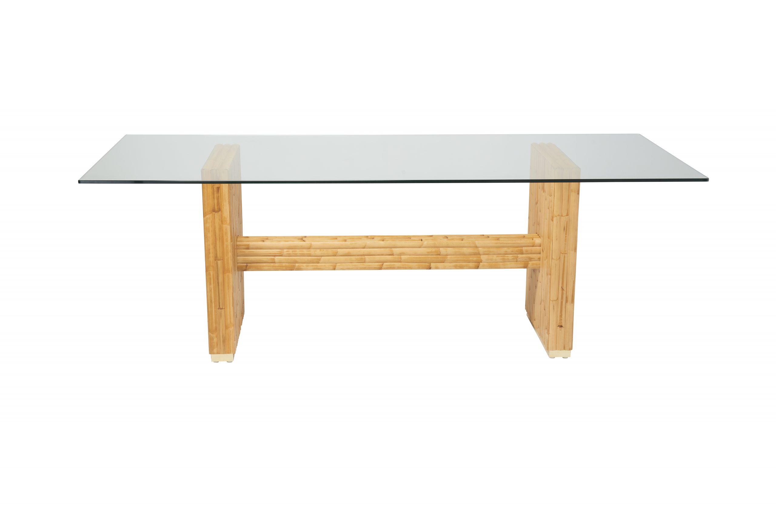 La structure associe un cœur en bois massif habillé de canne de rotin naturel semi-écorcé, révélant les nuances subtiles et irrégulières de la matière. Cette richesse visuelle est délicatement soulignée par un cerclage en laiton au pied de la table, apportant une touche raffinée et graphique. Le plateau en verre transparent laisse pleinement s’exprimer le travail du rotin, tout en apportant légèreté et confort d’usage au quotidien.
