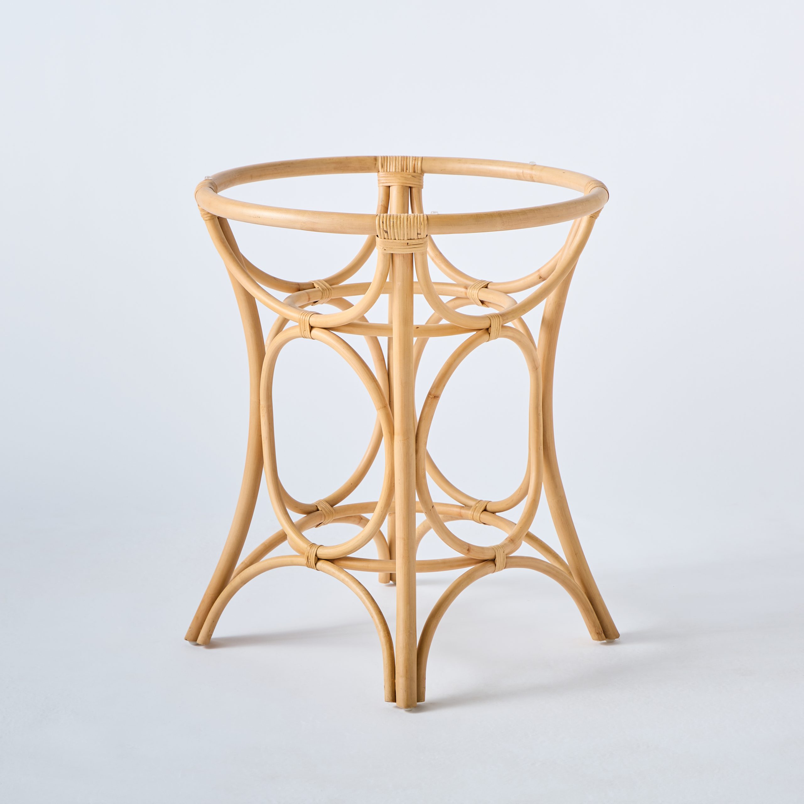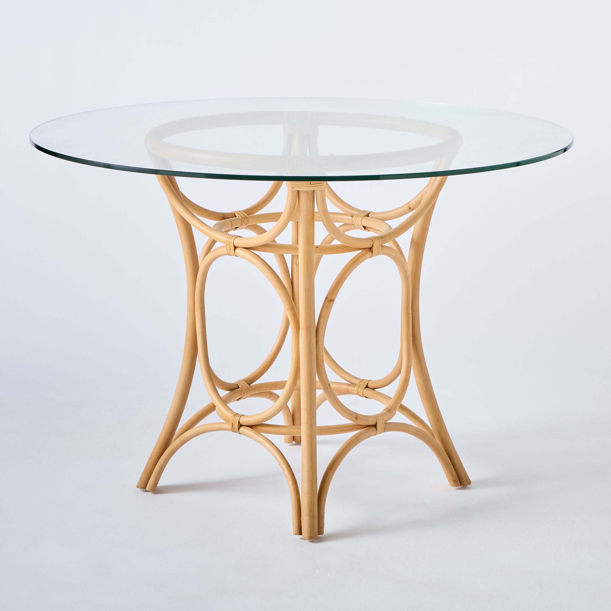 La table ronde en rotin Gingko avec plateau en verre revisite avec élégance les codes graphiques du mobilier en canne de rotin. Sa base sculpturale, rythmée par des arcades auto-renforcées et des ligatures généreuses, révèle le veinage vivant et légèrement sauvage du rotin naturel. Associée à un plateau en verre transparent, cette table en rotin gagne en légèreté visuelle tout en affirmant une vraie présence décorative.