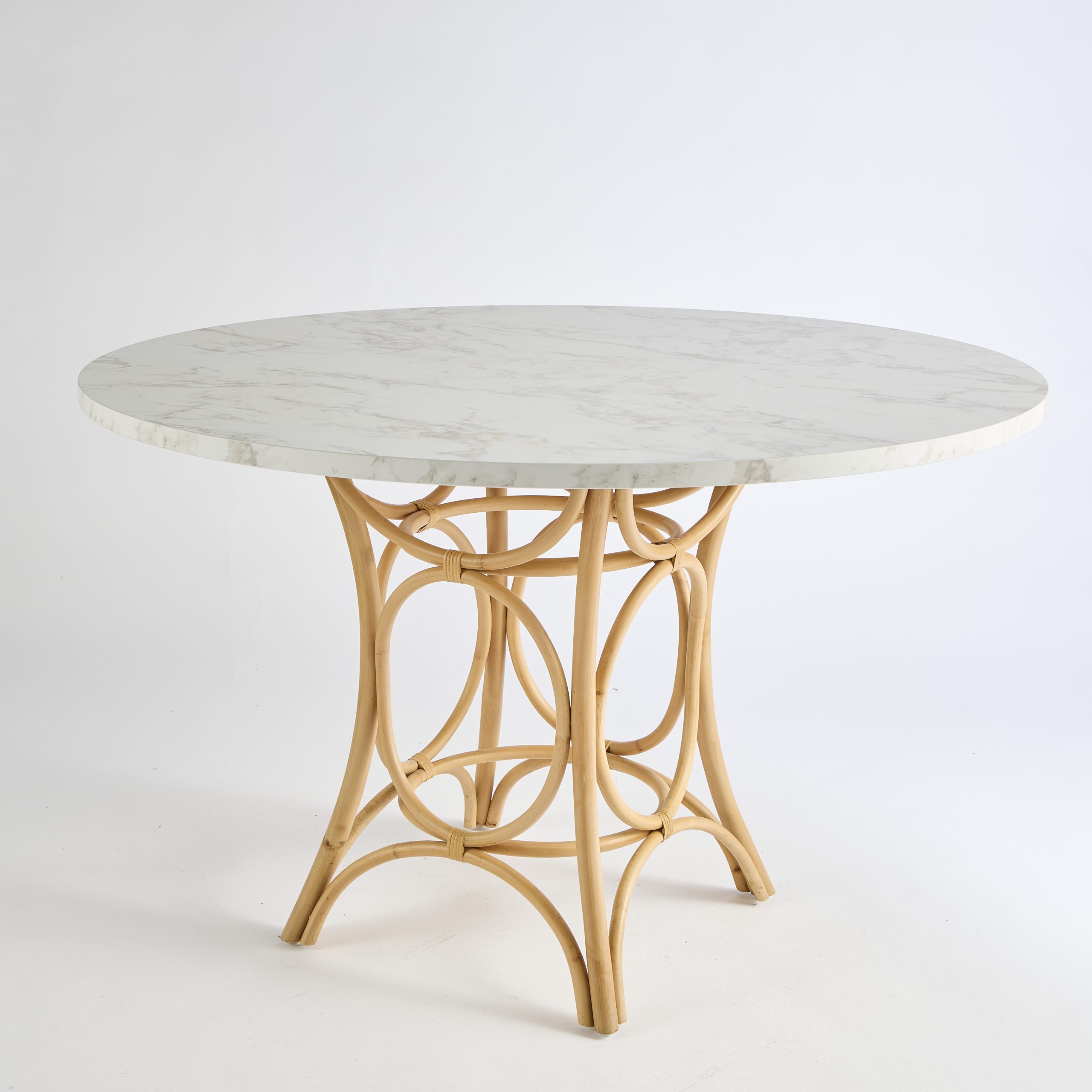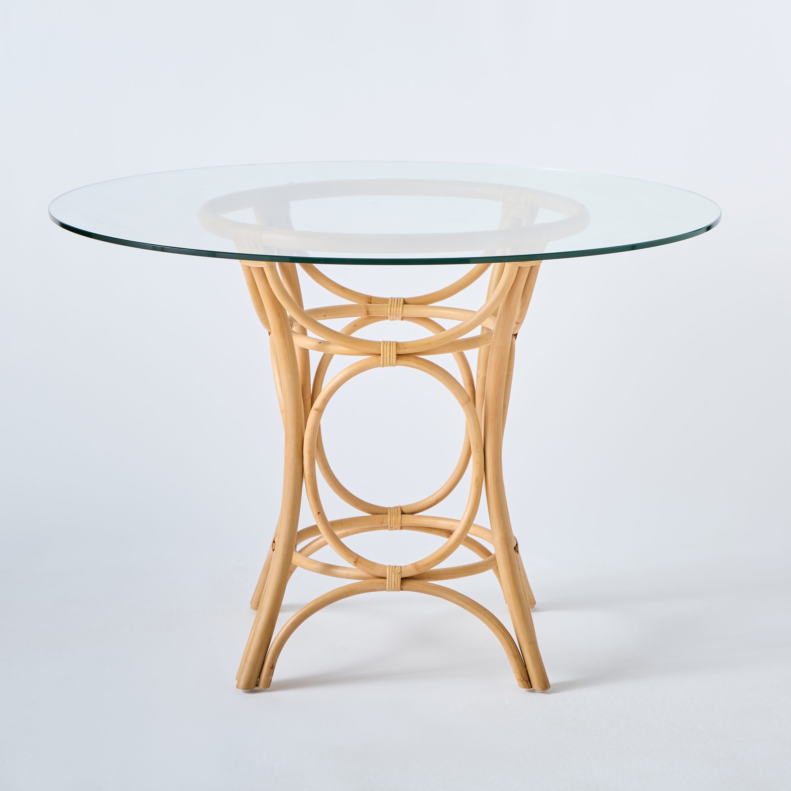 Cette table ronde en rotin naturel séduit par l’équilibre subtil entre matière et transparence. Le piètement en canne de rotin demi-écorcée dessine une structure graphique et stable, tandis que les ligatures en éclisse de rotin soulignent le savoir-faire artisanal. Le plateau en verre clair, aux bords droits rodés, laisse apparaître toute la beauté de la base et apporte une touche contemporaine à cette table repas en rotin.