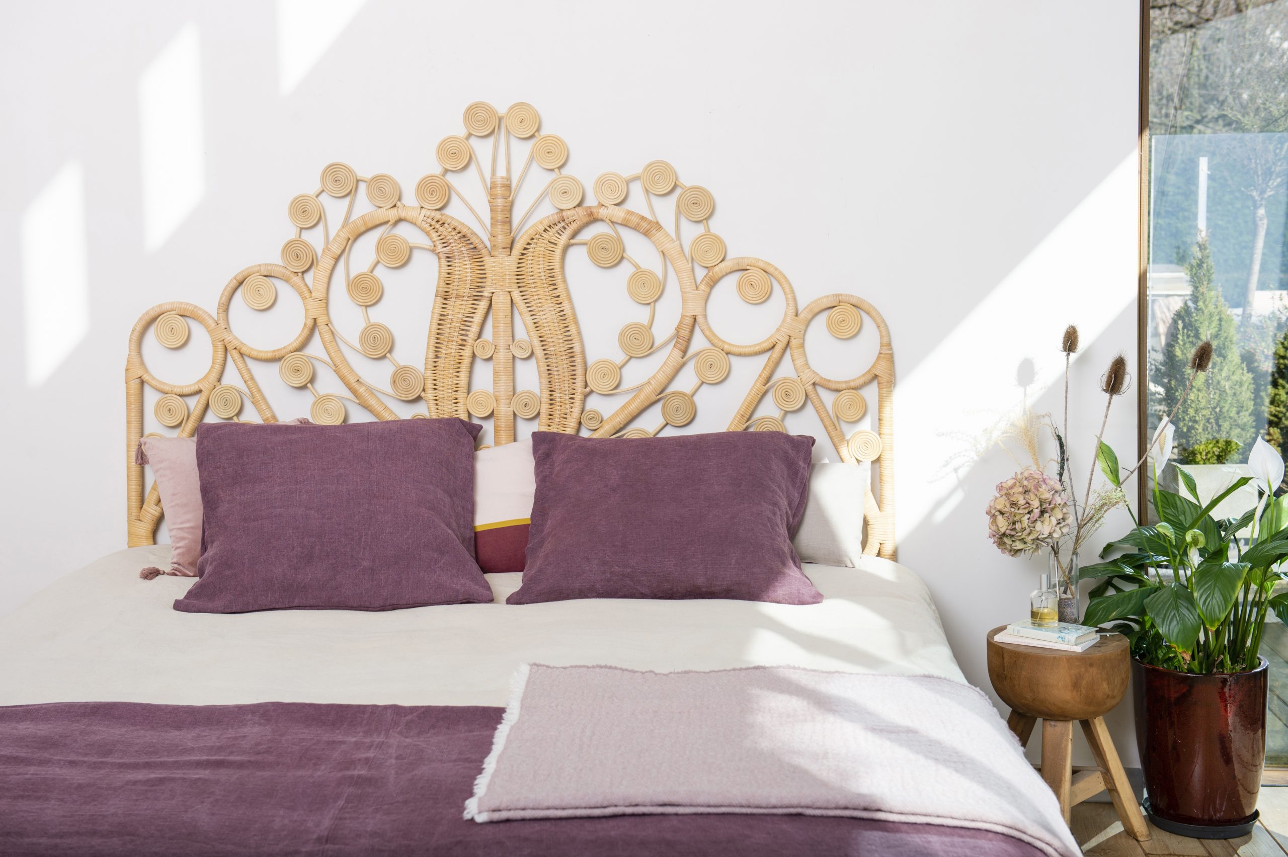 Une tête de lit en rotin naturel aux volutes délicatement sculptées, qui évoquent l’élégance des intérieurs d’ailleurs. Son tressage aérien capte la lumière et habille le mur avec poésie, créant une atmosphère enveloppante et chaleureuse. Plus qu’un simple élément de mobilier, elle devient une véritable pièce décorative, invitant au calme, au rêve et à l’évasion.